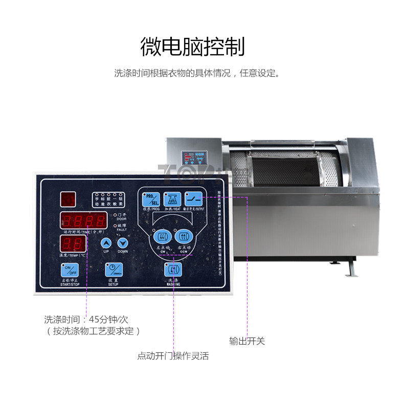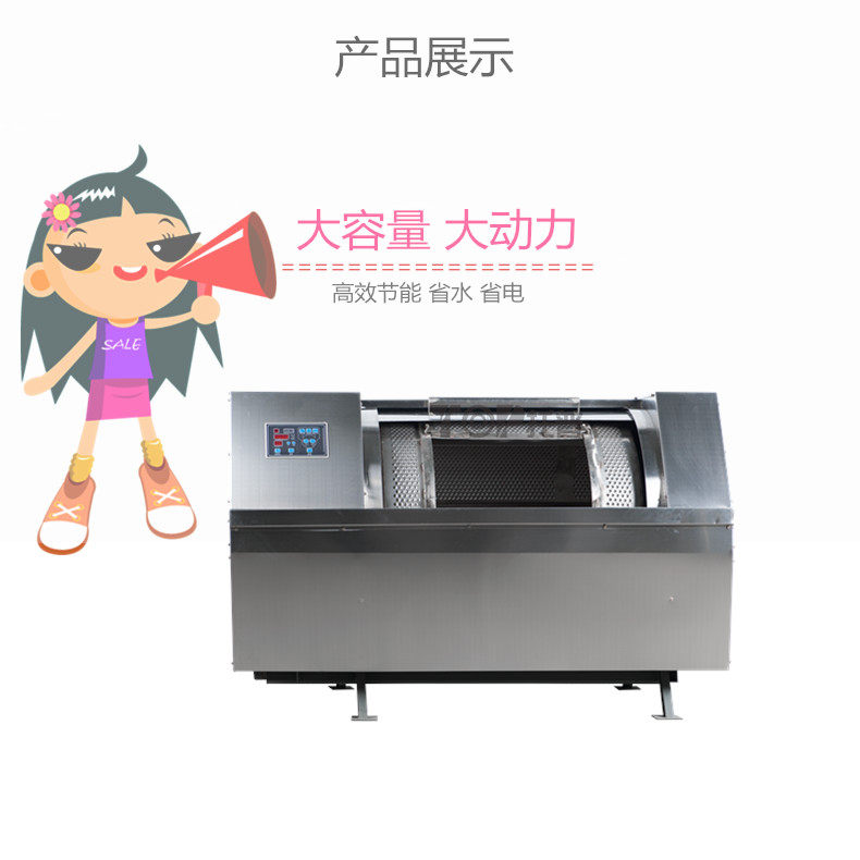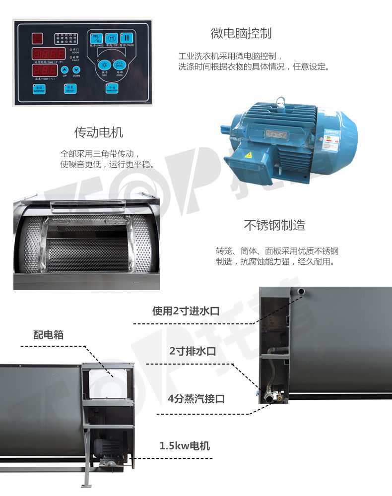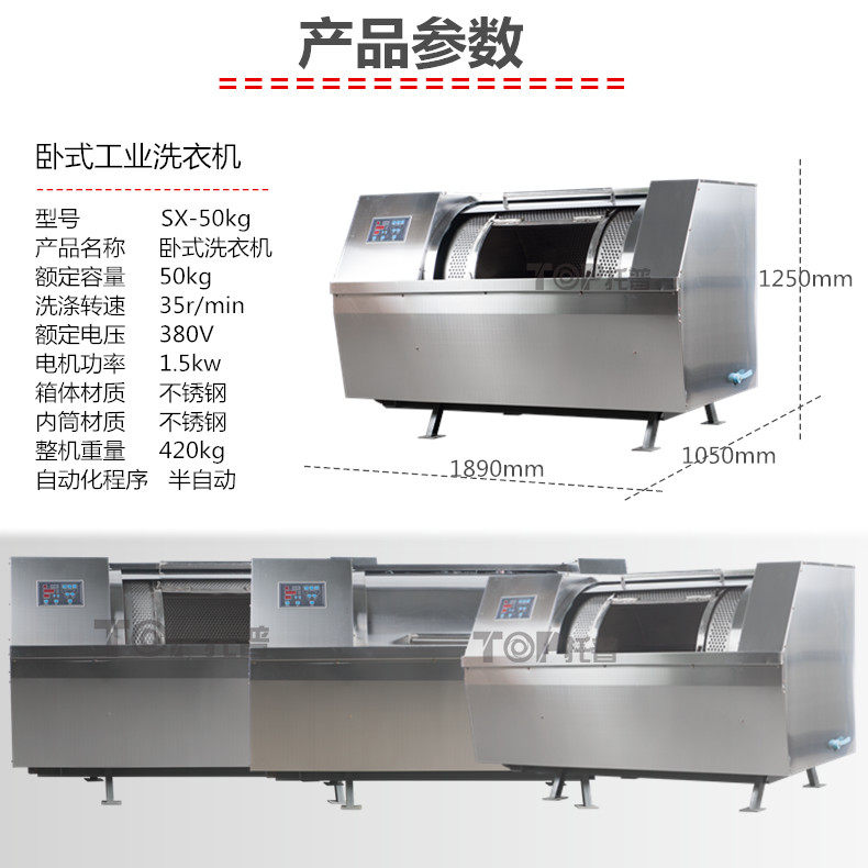 ◎ 用材精良,面板及内胆采用优质材料制造,外缸墙板采用喷锌处理,经久耐用,使用寿命长。 ◎ 机械控制操作简便,卧式设计,经济实用。 ◎ 采用二级皮带传动,传动平稳,维修方便。