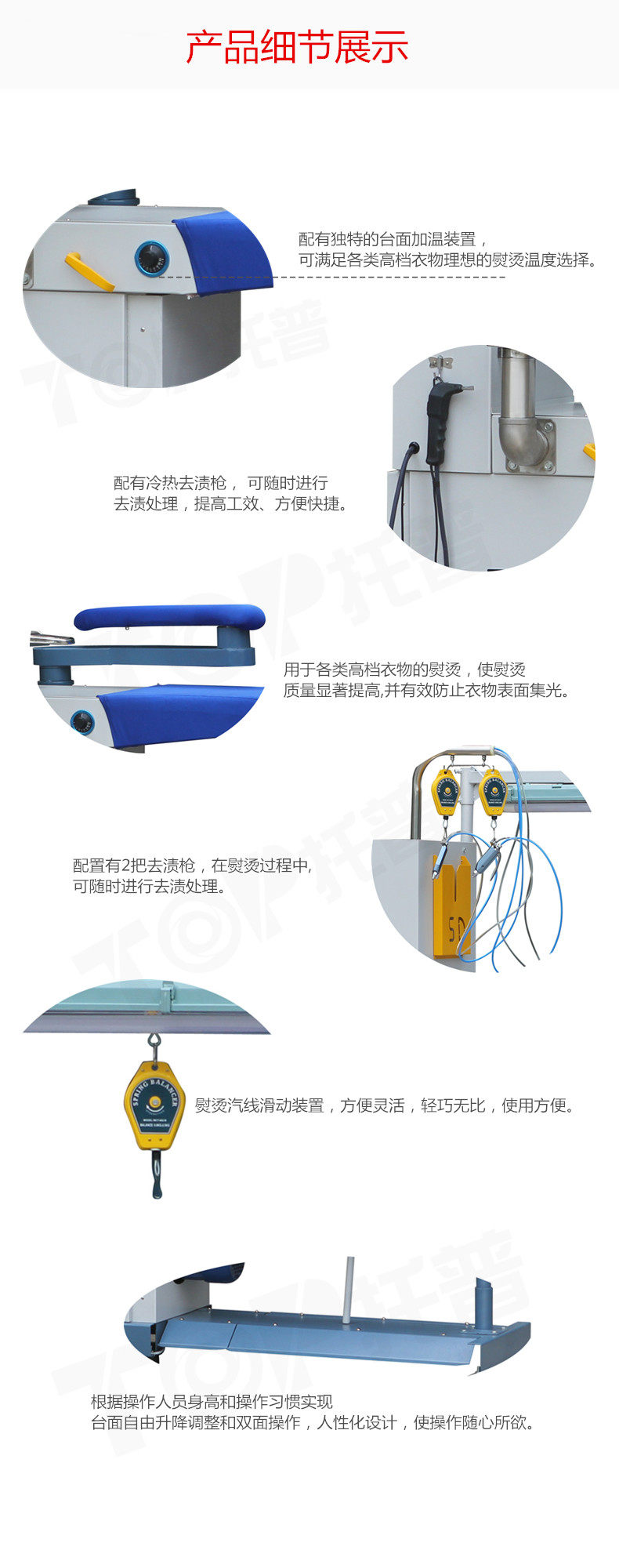 多功能熨烫台,简单明了的电气面板控制,易操作。配备了吸风去渍摇臂,热去渍枪,冷去渍枪,使熨烫台有了去渍功能,实现了一机多用。台面采用冲孔镀锌板,内置台面电加热装置,使台面干燥,熨烫效果更加。